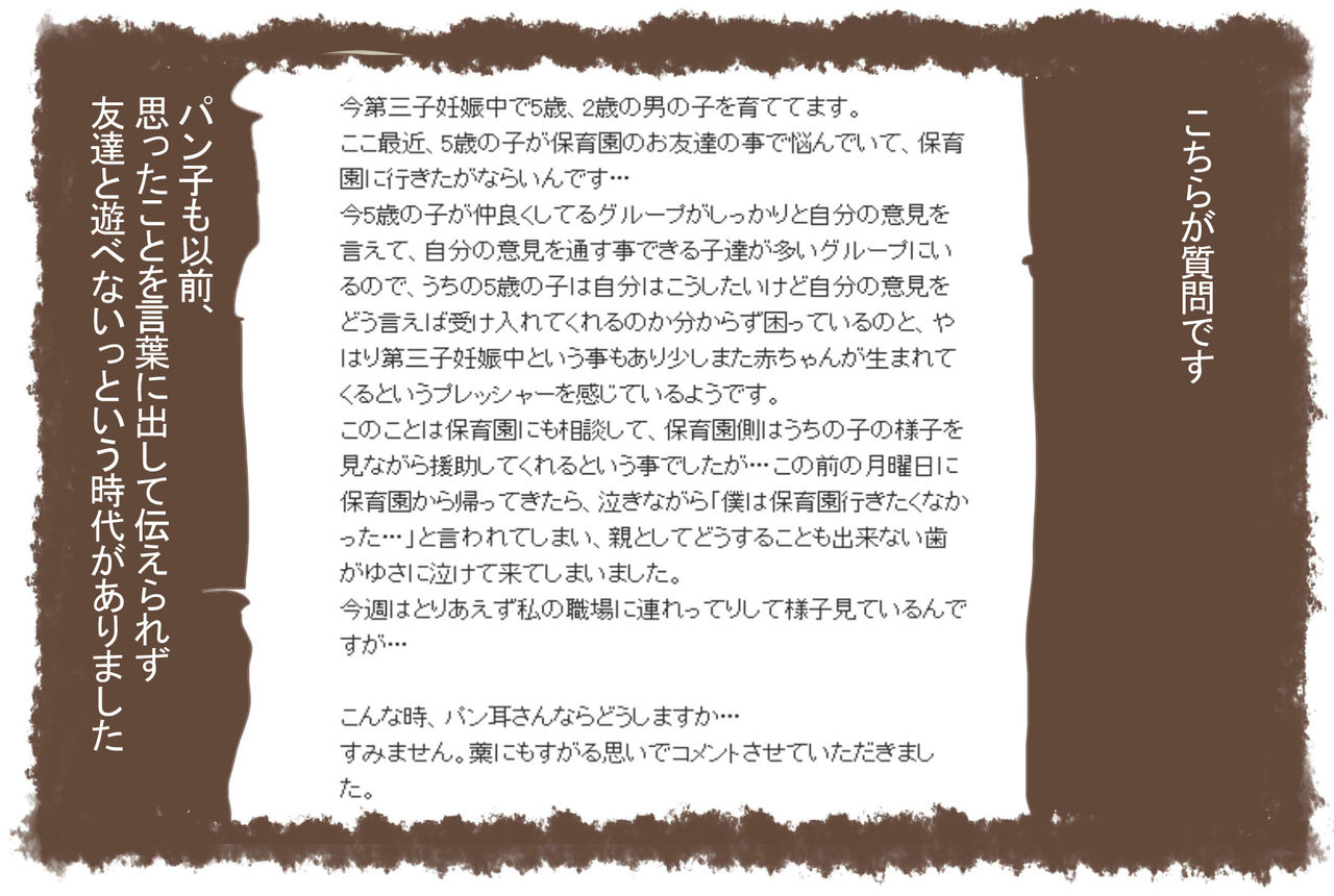 ブログに掲載していただいてありがとうございます!パン耳さんのアドバイスを参考に長男がまた保育園を楽しんで行けるようにいろいろ試してみたいと思います!