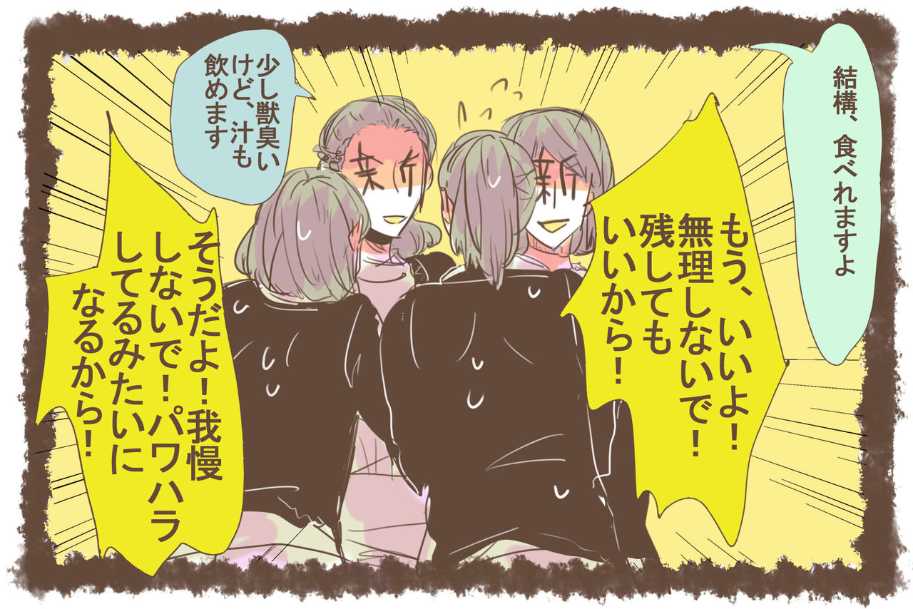 新人に無理やり残り物を食べさせる先輩と、周囲に誤解されないように最後は必死で止めた