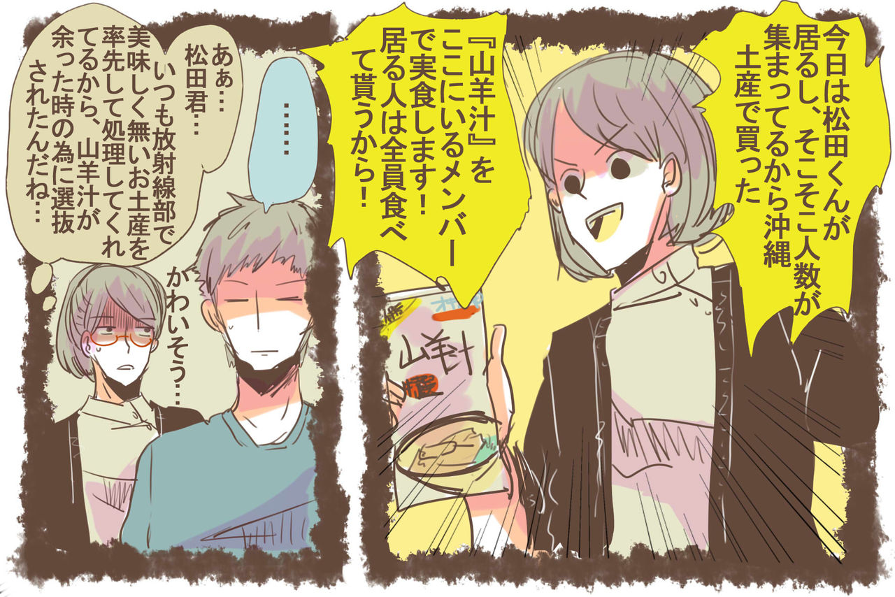 心優しきマッチョの松田君は放射線部では美味しくないふりかけとか、美味しくないお菓子も『だいたい美味しく食べてくれる』とても心強い青年なんですが今回はダメでした