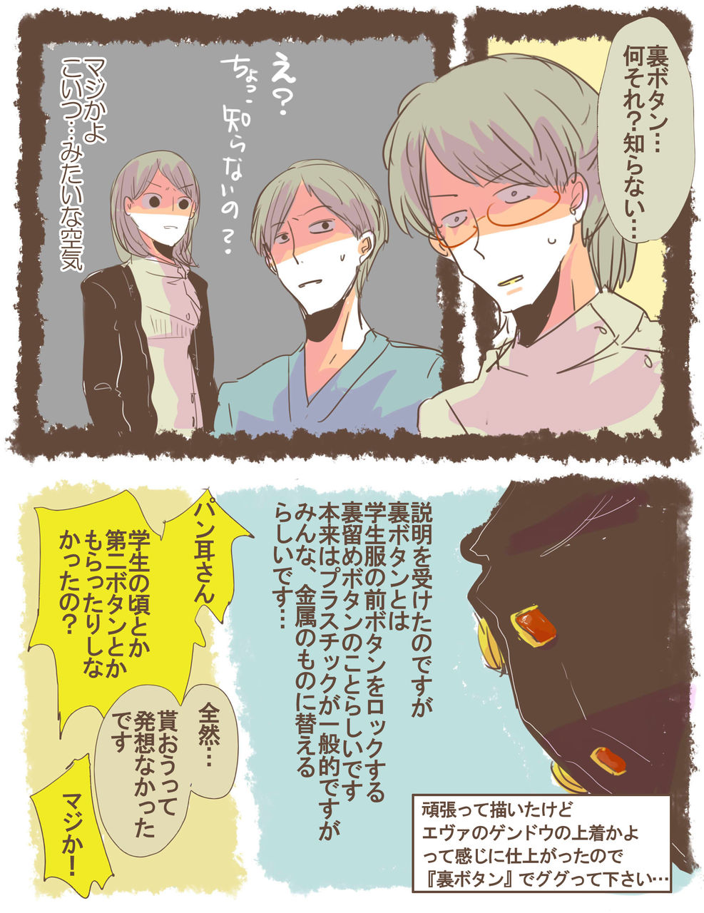 兄が居たのに私が『裏ボタン』の存在を知らないことに、みな驚愕してました。ちなみに裏ボタンの画像を検索して見るとお分かり頂けると思いますがヤンキー感が凄いです