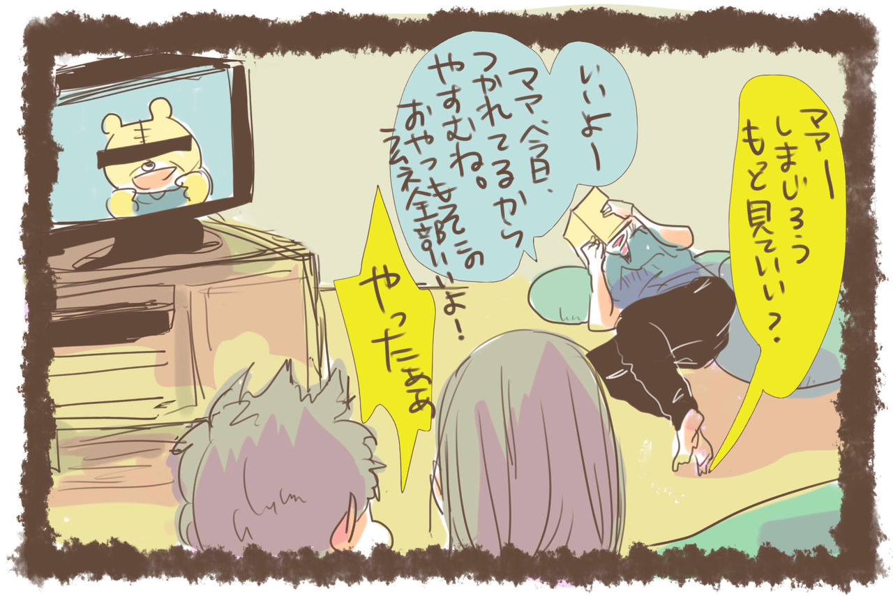 家事の手抜きなんてお手のものですが、正直子供の相手が1番疲れる…一緒に遊ぼう攻撃を阻止するべく休みたい日はテレビ見放題!そしていつもは小分けにして与えているじゃがりこも1人1カップの大盤振る舞いです!笑
